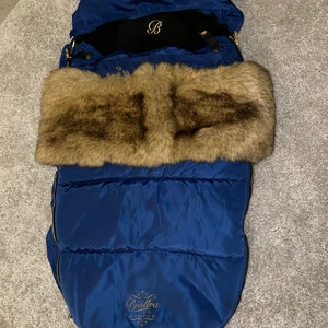 Åkpåse i nyskick . Märket : Bjällra of Sweden . Nypris 1100:- , luva, kudde och avtagbar päls. Spänns fast med hjälp av vagns bältet . Håller värmen