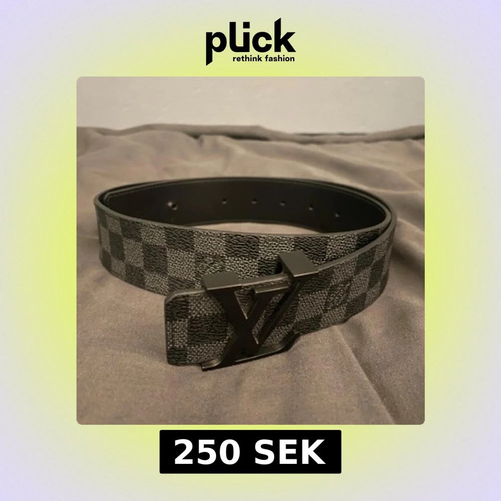 Snyggt L V bälte i svart och grått med klassiskt rutigt mönster och stor L V-logga i metall som spänne. Bältet är gjort i skinn och har en modern, stilren vibe. Perfekt accessoar för att lyfta din outfit med en lyxig touch.