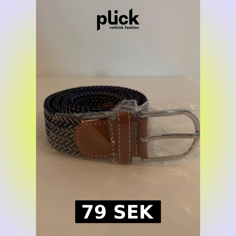 Snyggt mörkblått flätat bälte med vita ränder och detaljer i brunt skinn. Spännet är i silverfärgad metall och bältet har en cool, modern look som passar till jeans eller chinos. Perfekt accessoar för att lyfta din outfit med lite extra stil.
