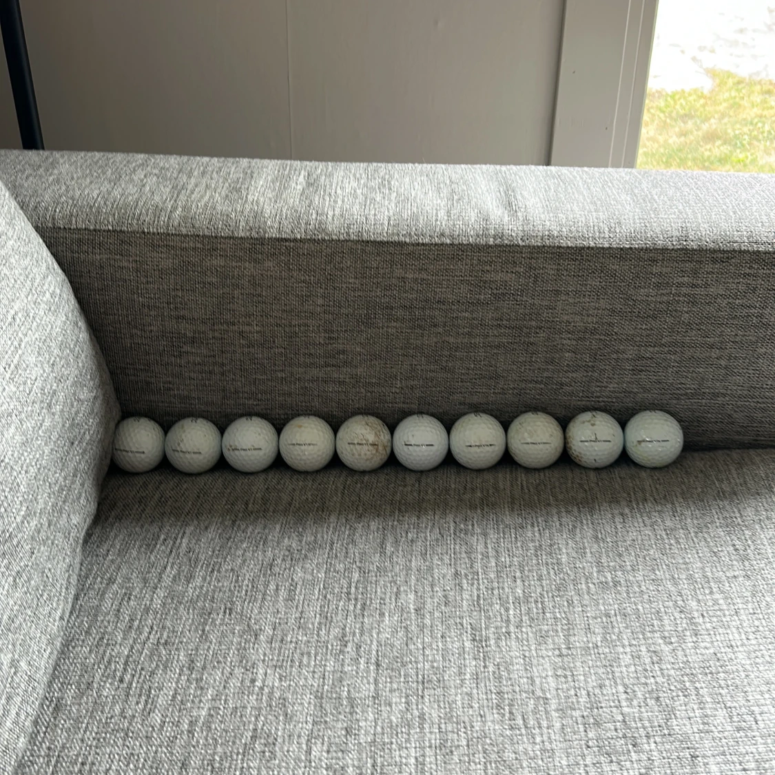 Bilderna visar en rad med golfbollar av märket Titleist Pro v1, de är i okej skick och vill sälja av snabbt