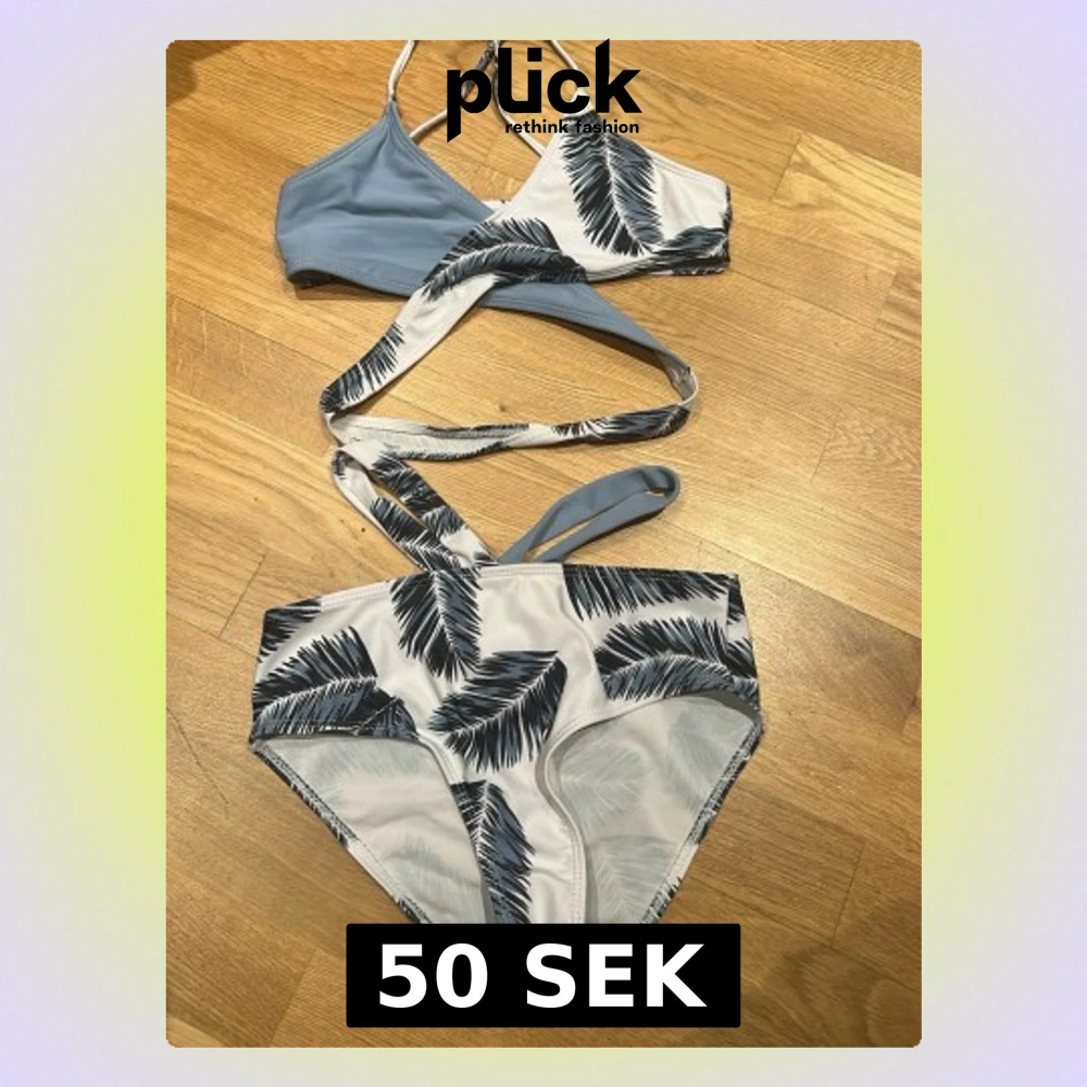 Säljer en snygg bikini i blått och vitt med tropiskt palmbladsmönster. Överdelen har smala axelband och omlott-detalj, medan underdelen har hög midja och matchande mönster. Materialet är mjukt och stretchigt i polyester och elastan.