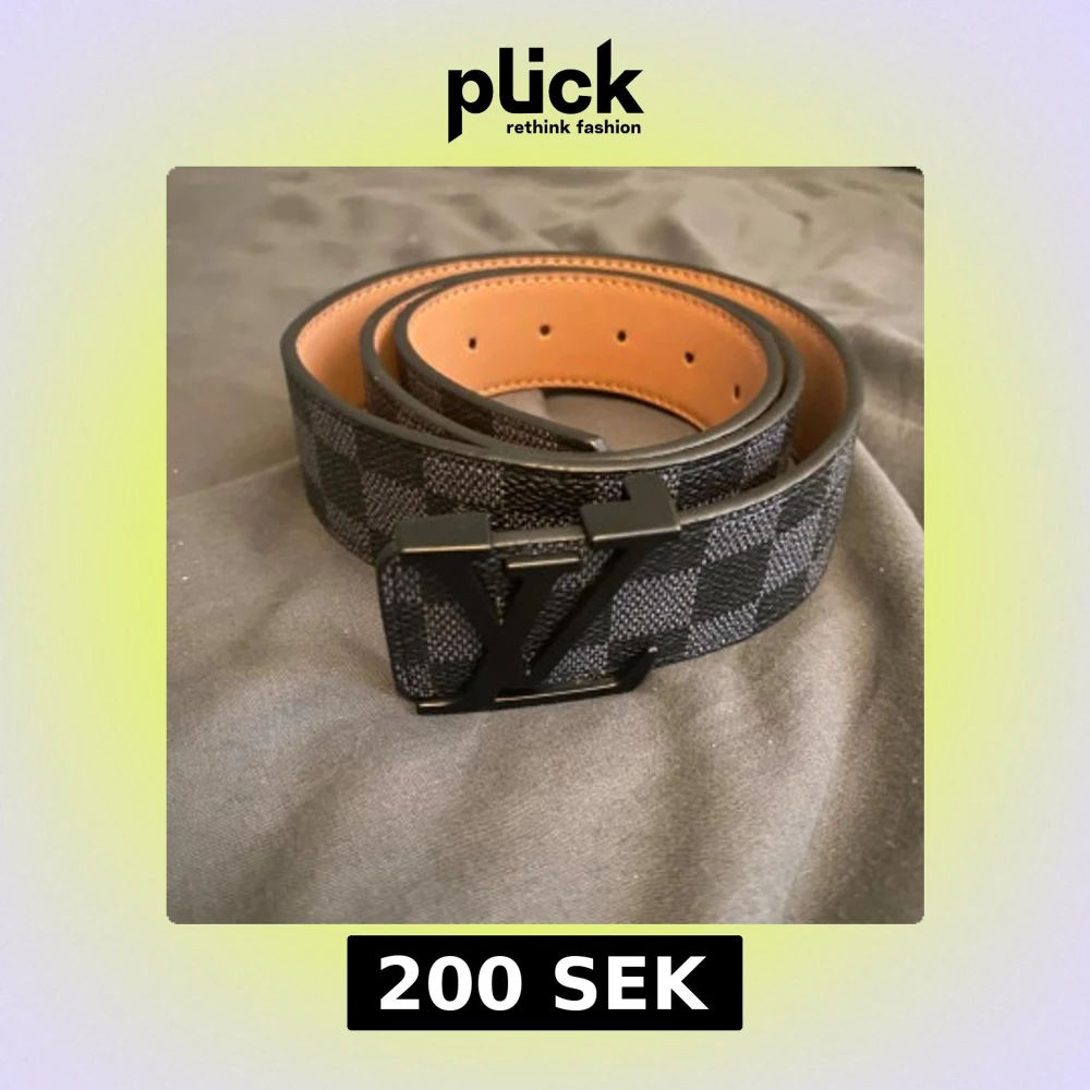 Säljer ett snyggt L V bälte i svart och grått med klassiskt rutigt Damier-mönster. Bältet har en stilren L V-spänne i svart metall och är tillverkat i exklusivt skinn. Perfekt accessoar för dig som vill ha en lyxig och modern look.