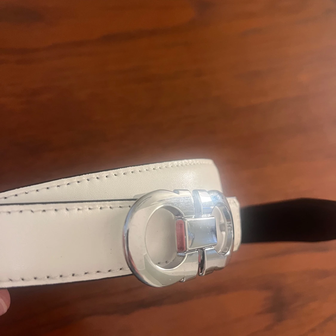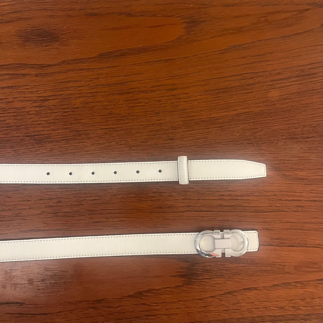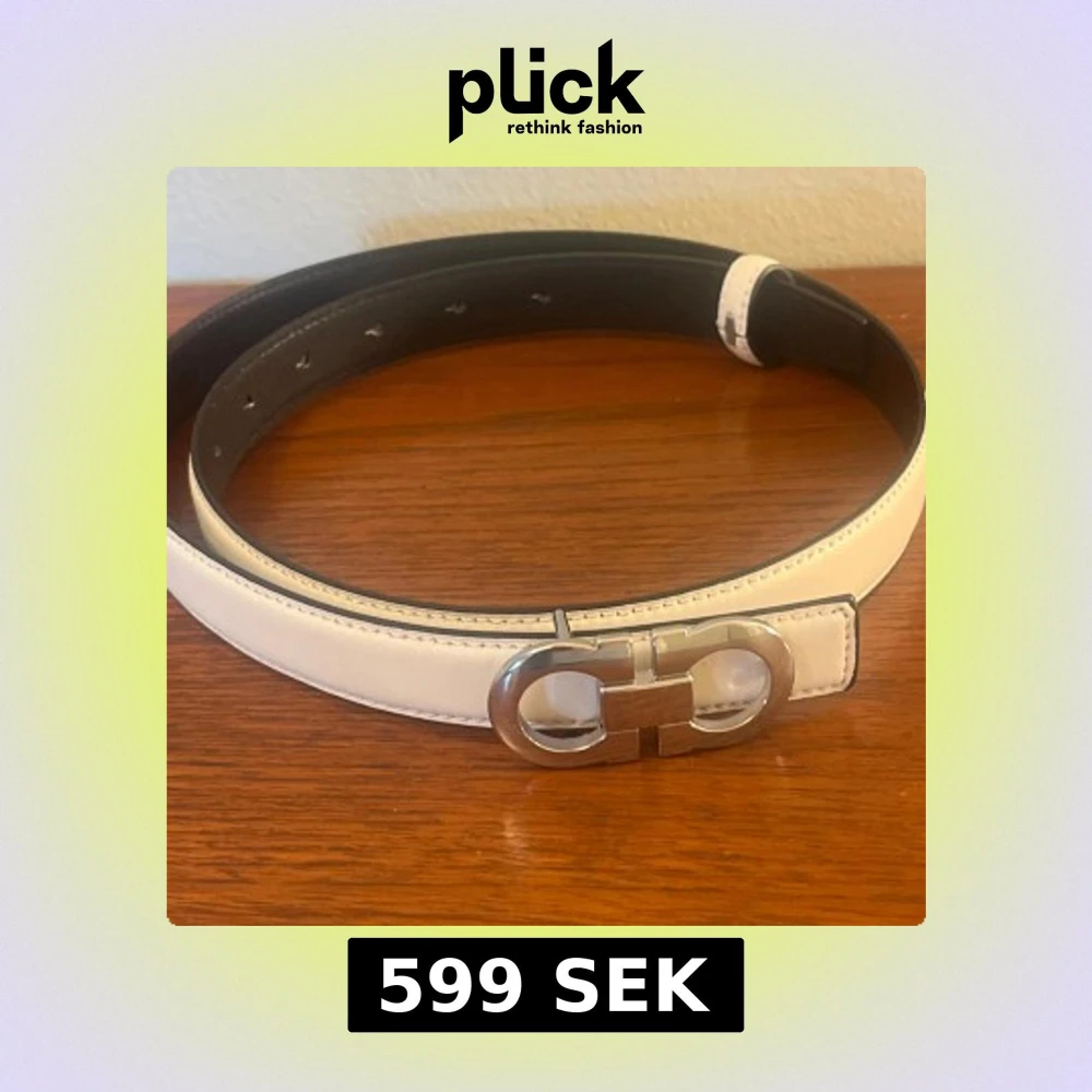 Snyggt vitt bälte från Salvatore Ferragamo i skinn med en ikonisk silverfärgad dubbel-Gancini-spänne. Bältet har stilrena sömmar och en klassisk, rak form. Perfekt för att lyfta din outfit med en exklusiv touch. Min leverantör säger att den är äkta, men jag tvekar därför det låga priset. det är kvinno modellen det innebär att det är lite mindre/smalare.