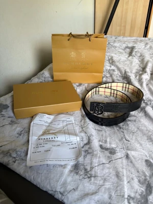 Säljer ett snyggt bälte med den ikoniska rutiga designen i beige, svart och röd. Perfekt accessoar för att lyfta din outfit med lyxig känsla. En bälte som man kan vända på svart eller beige