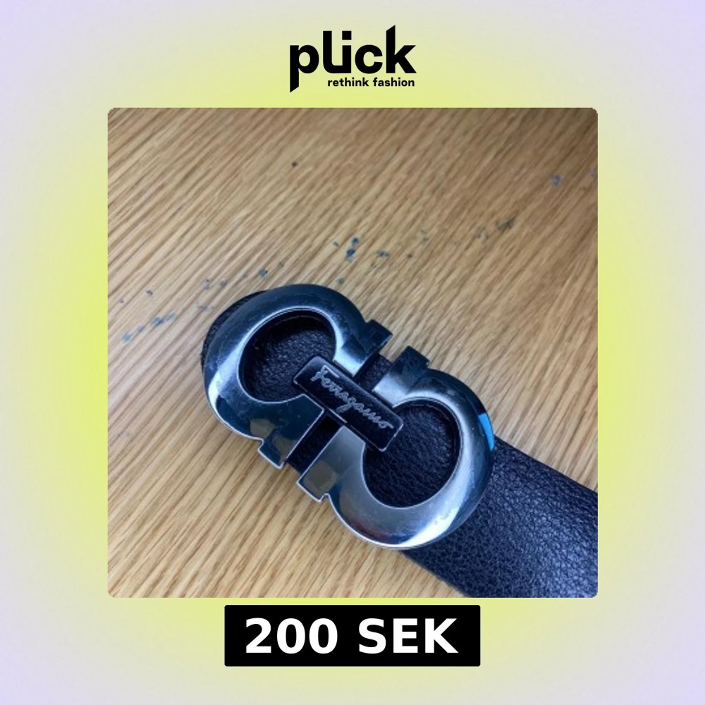 Säljer ett svart bälte från Ferragamo med ett stort, blankt silverfärgat spänne i metall. Bältet är gjort i skinn och har en klassisk, stilren design med Ferragamo-loggan på spännet.