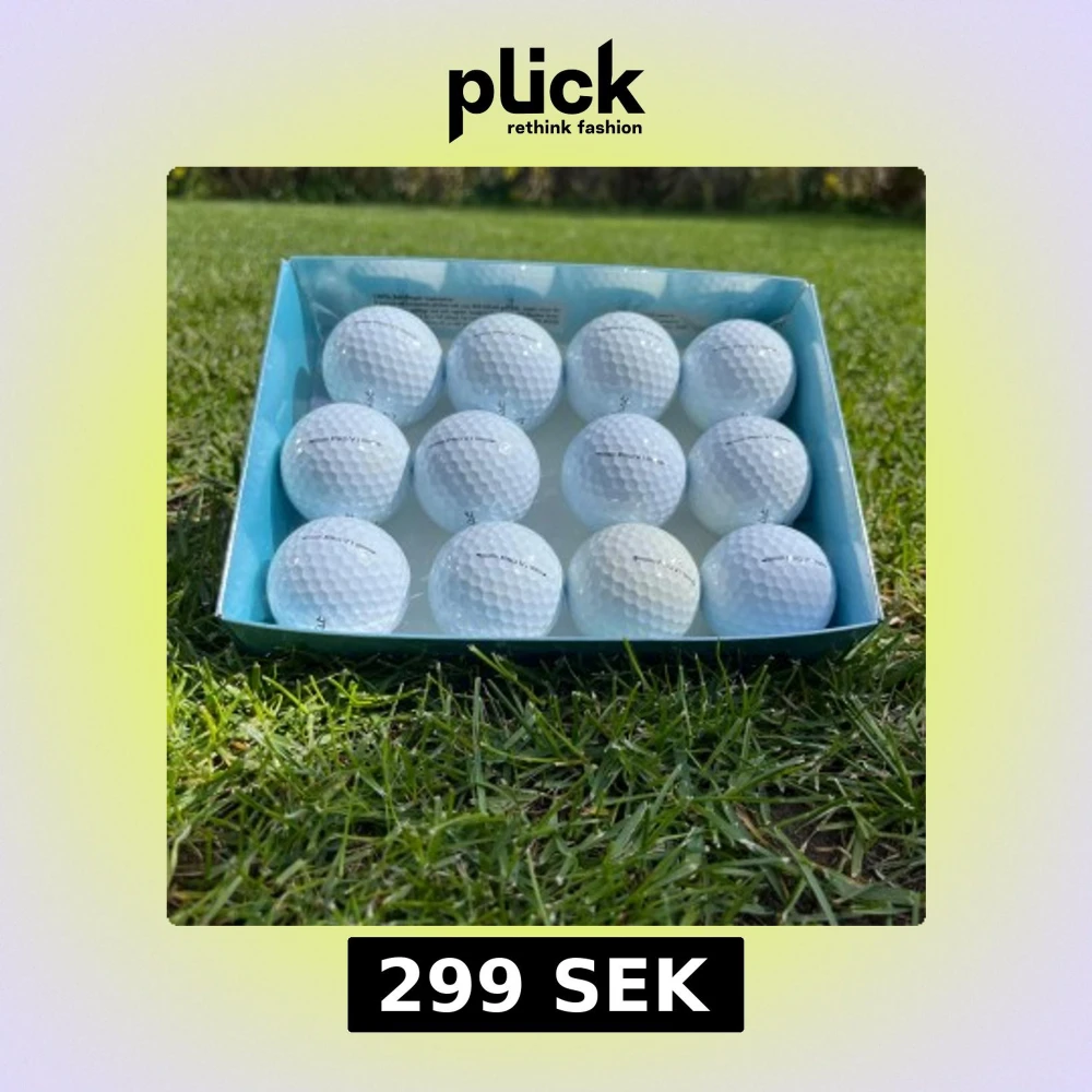 Säljer en ask med tolv vita golfbollar. Bollarna har klassisk dimple-design och levereras i en blå kartong. Perfekt för dig som vill fylla på golfutrustningen inför säsongen.