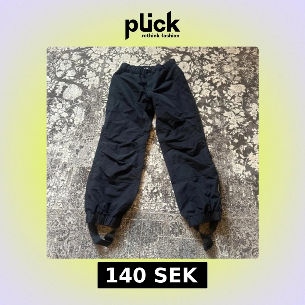 Svarta täckbyxor från Kaxs Proxtec i storlek 128. Byxorna har resår i midjan och vid bensluten, samt praktiska fothällor och reflexdetaljer på benen. Tillverkade i slitstarkt syntetmaterial som står emot väta och vind, perfekta för kalla dagar.
