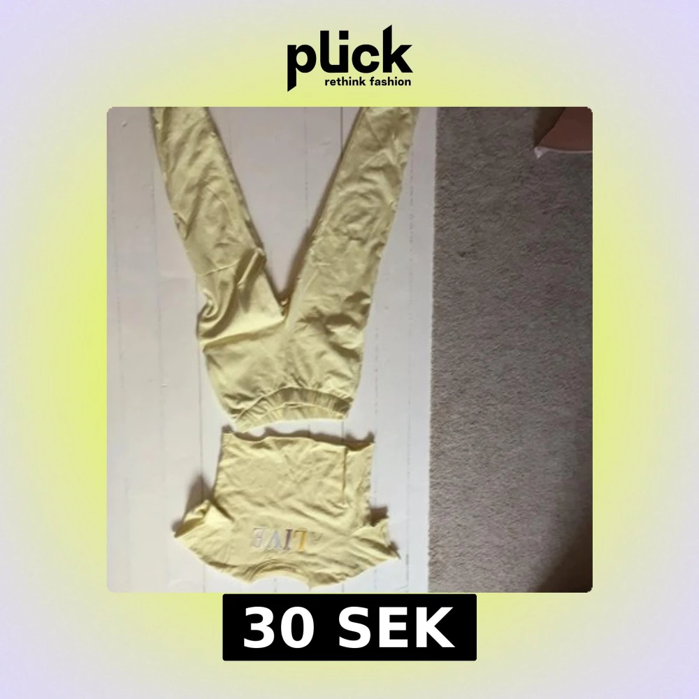 Gult sett från Bo Ohlsson. Tryck på tröjan "ALIVE". Tröjan var från början långärmad och lite längre men är nu klippt som en kort t-shirt. Lurvigt foder inuti. Perfekt för en vår och sommar look! 30kr för båda!