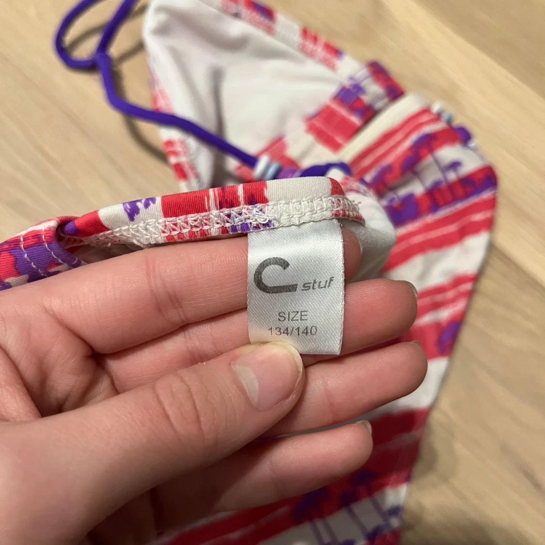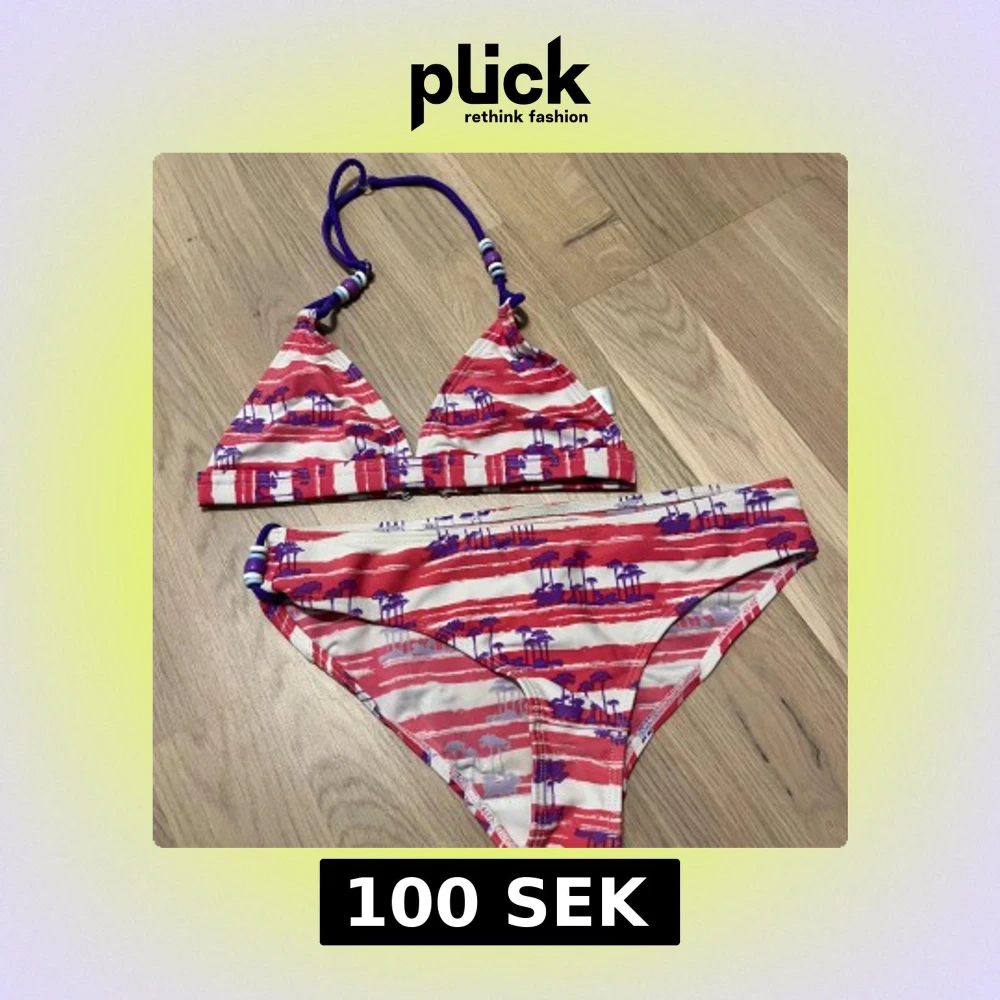 Snygg bikini med rött och vitt randigt mönster och lila palmer. Toppen har trekantsform med justerbara band och pärldetaljer. Perfekt för sommarens stranddagar!