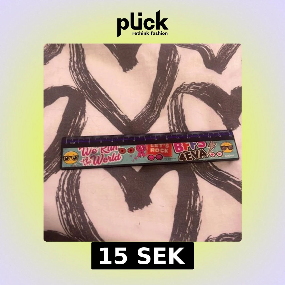 En färgglad linjal med texten 'We Run the World', 'Let's Rock' och 'BFFs 4EVA', dekorerad med coola emojis och symboler. Perfekt för att göra skolarbetet lite roligare och mer personligt!lite fläckig