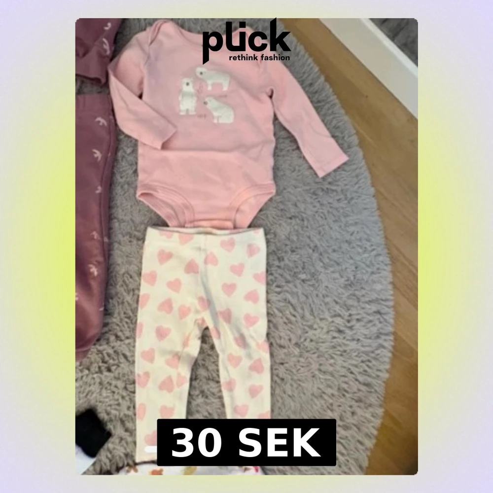 en rosa långärmad body med björntryck från Pekkie och ett par vita leggings med rosa hjärtan,