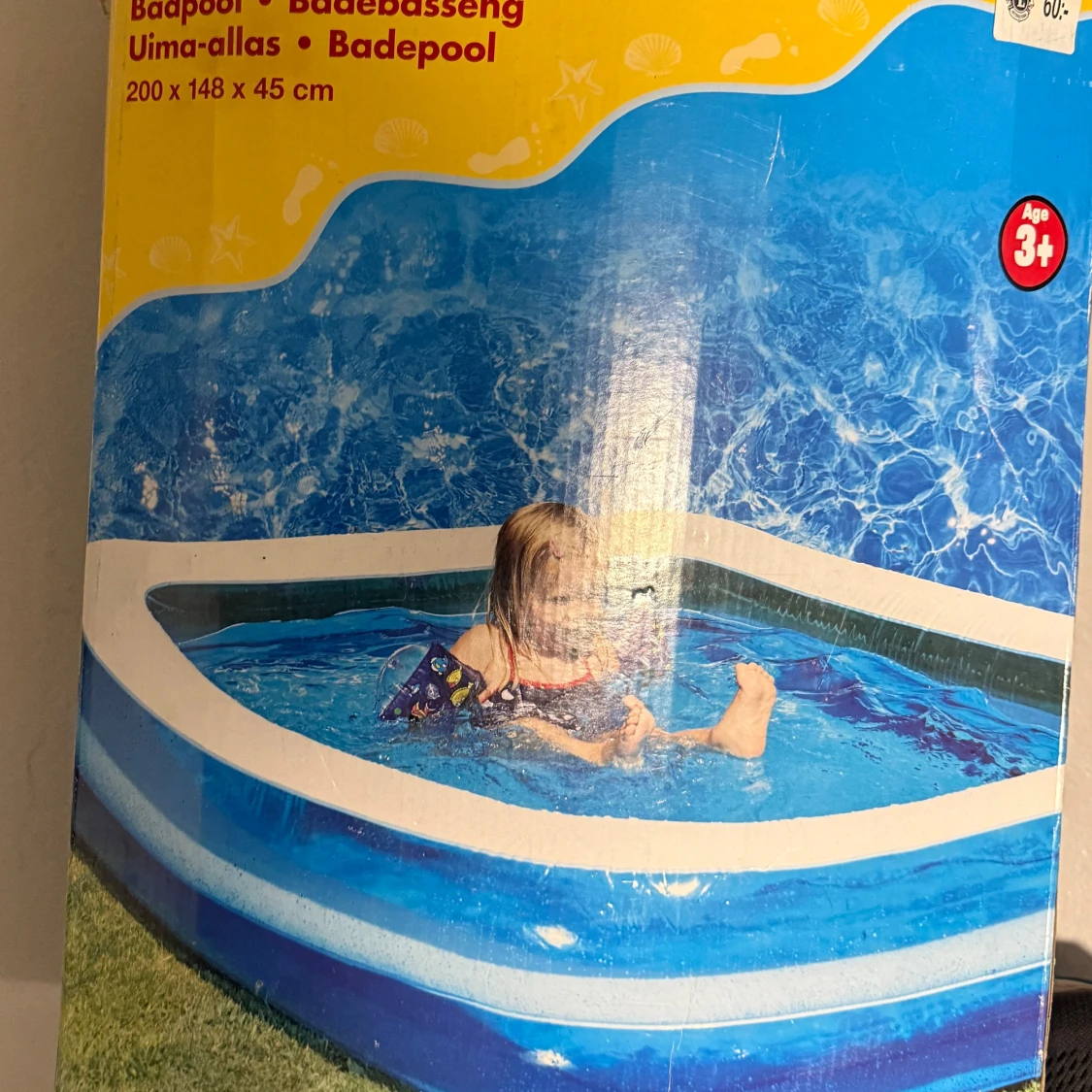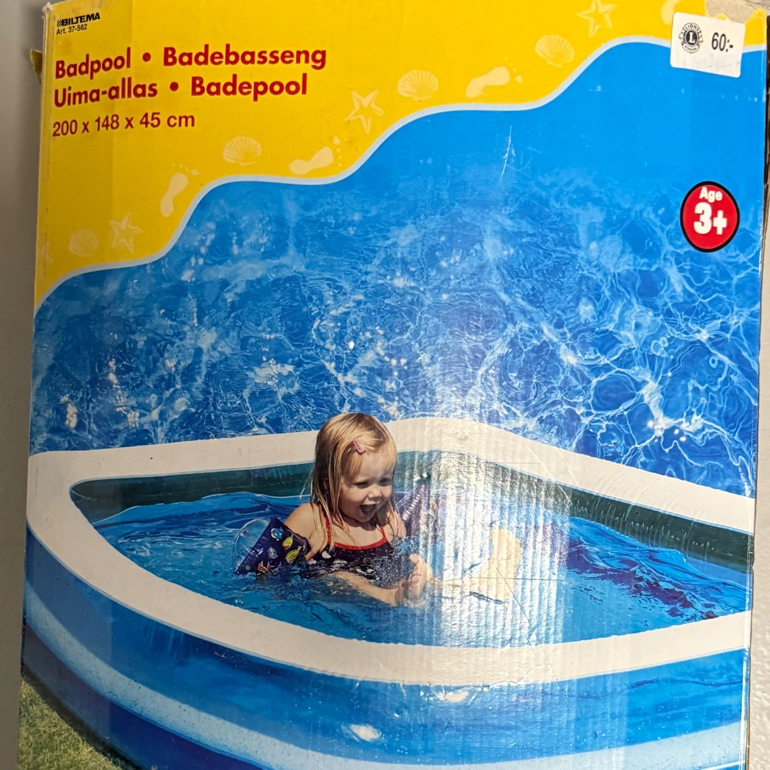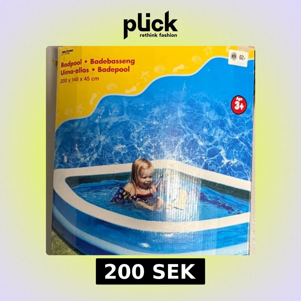 Uppblåsbar badpool från Biltema, mått 200 x 148 x 45 cm. Passar barn från 3 år och uppåt. Poolen har en fräsch blå design och ser ut att vara i gott skick, perfekt för sommarens lek och svalka i trädgården.