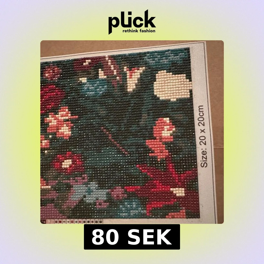 Säljer en kvadratisk diamond painting med färgglatt blommotiv. Tavlan är 20x20 cm och består av små pärlor i nyanser av rött, rosa, blått, grönt och vitt.
