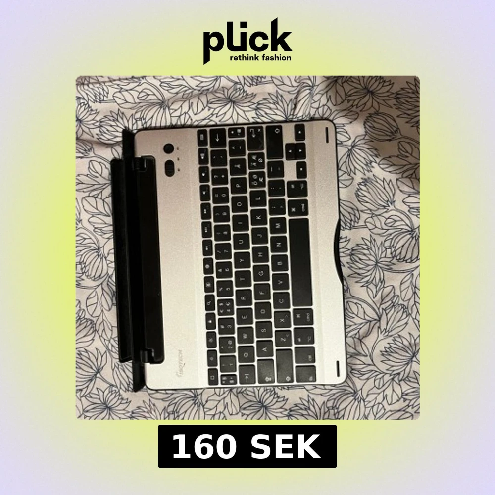 Säljer ett silverfärgat tangentbord med svarta tangenter. Det har en kompakt design och är perfekt för att kopplas till en surfplatta. Tangentbordet har en hållare för att enkelt fästa en enhet och ger en smidig skrivupplevelse.