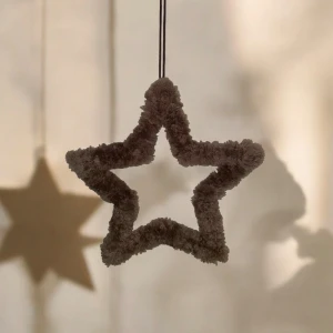 En charmig dekorativ stjärna i trä med mjukt och fluffigt material runt om. Perfekt för att hänga upp som dekoration i hemmet. Den har en neutral beige färg som passar in i de flesta inredningsstilar.