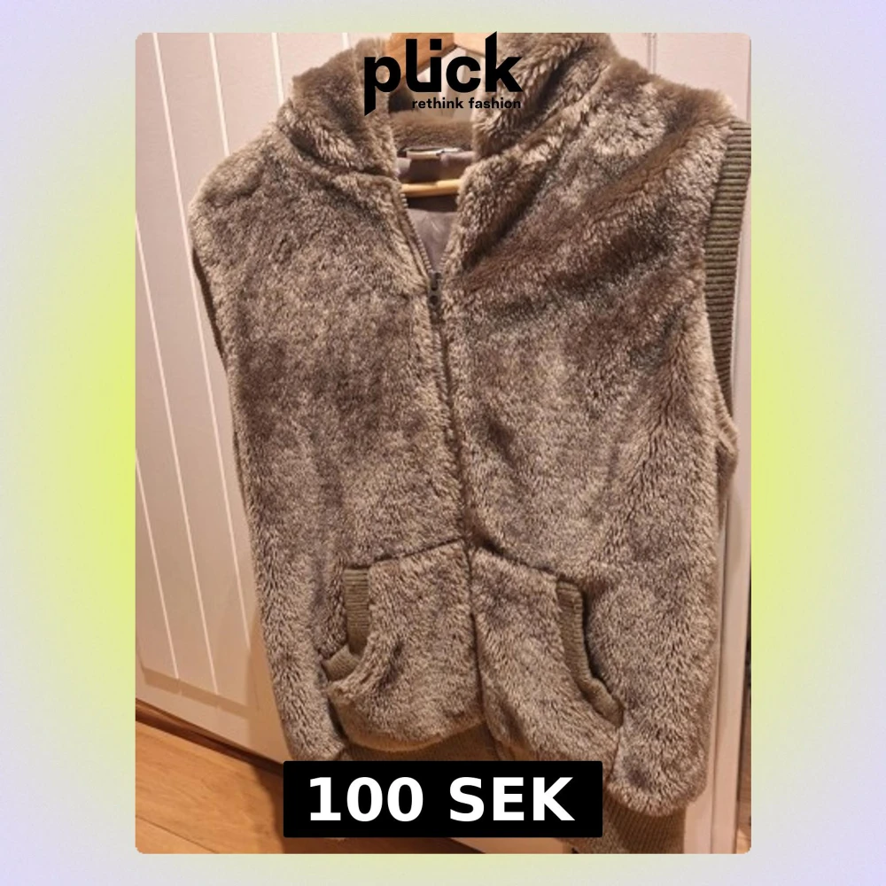 Säljer en brun pälsväst med huva och två stora fickor framtill. Västen har dragkedja och ribbstickade detaljer vid fickor och nederkant. Perfekt för lager-på-lager och extra mysig tack vare det fluffiga materialet.