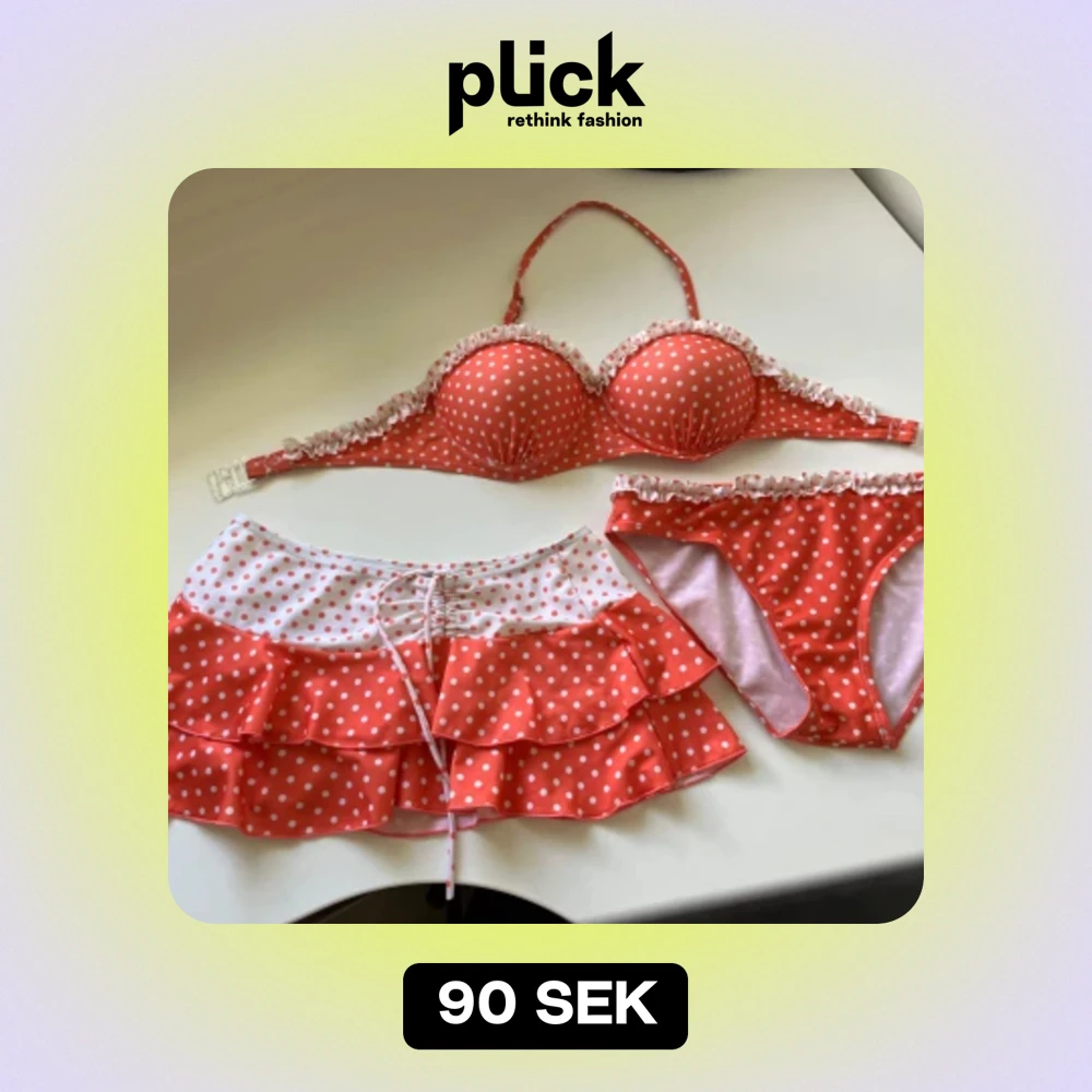3- delad Bikini med kjol. Märkt L men det är en utländsk storlek och motsvarar S/36 i vanliga svenska storlekar. Extra ilägg, även ett par i samt lösa byglar. Se bild 2.