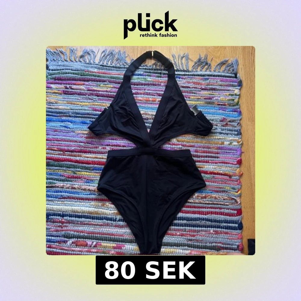 Snygg svart bikini med cut-out design och djup v-ringning. Halterneck med breda band och silvrigt spänne framtill. Hög midja och stilren look, perfekt för stranden eller poolen. Materialet känns mjukt och följsamt.