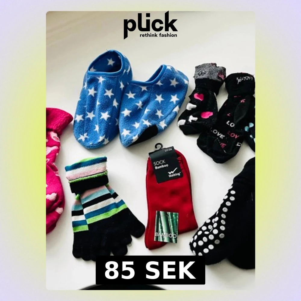 Strump-paket med åtta par olika strumpor i st. 37-39 - Tåstrumpor, använda ett par gånger - Halkstrumpor, nya - Bambustrumpor Nya med etikett kvar - Myssockor i mycket bra skick, använda ett par gånger. - tre par vanliga strumpor i använt skick, hela och har mer att ge. Fleece-tofflor, nyskick