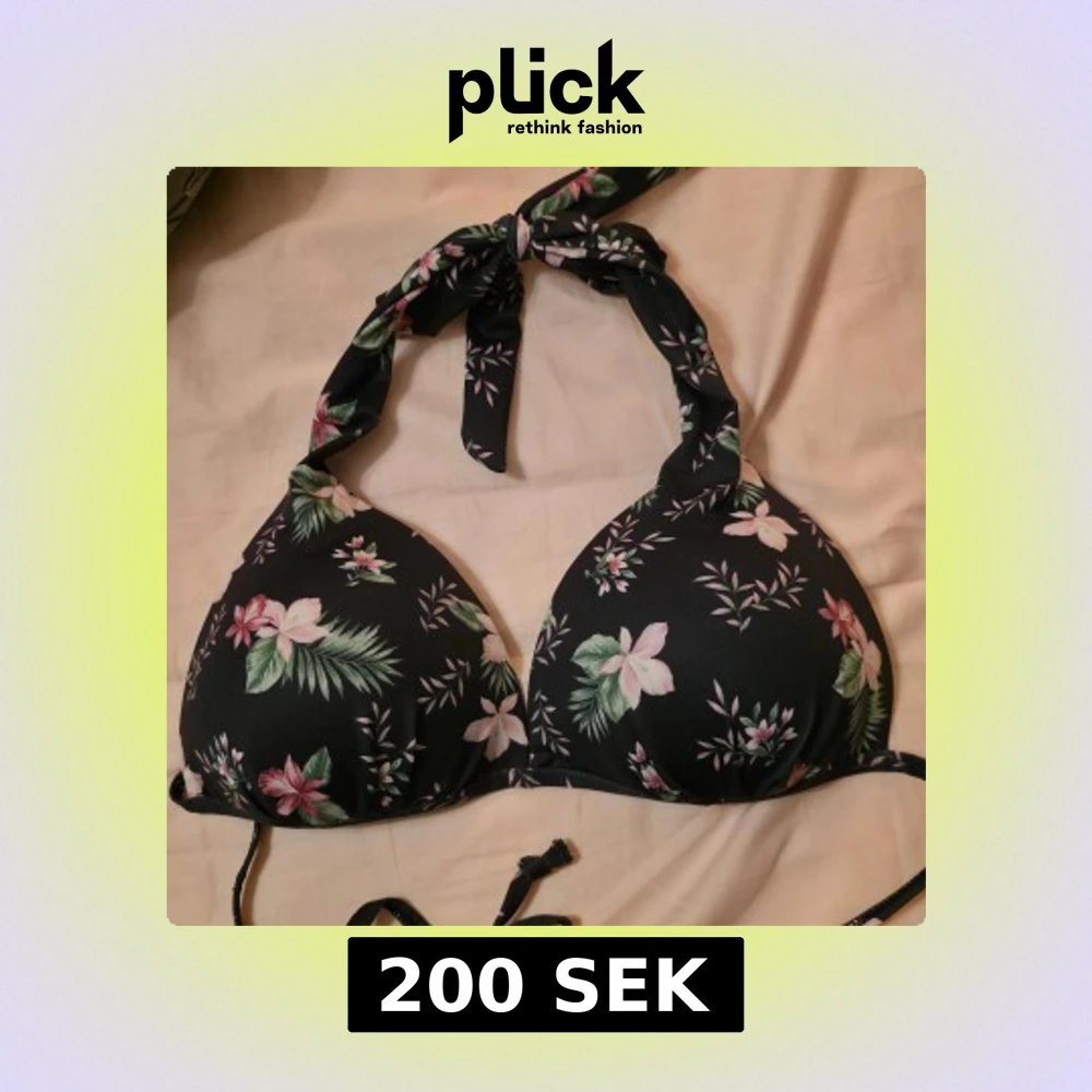Supersnygg svart bikini från Marine Classics med tropiskt blommigt mönster i rosa, grönt och vitt. Bikinin har knyt i nacken och under bysten för perfekt passform. Materialet är mjukt och följsamt, perfekt för lata dagar vid poolen eller stranden.