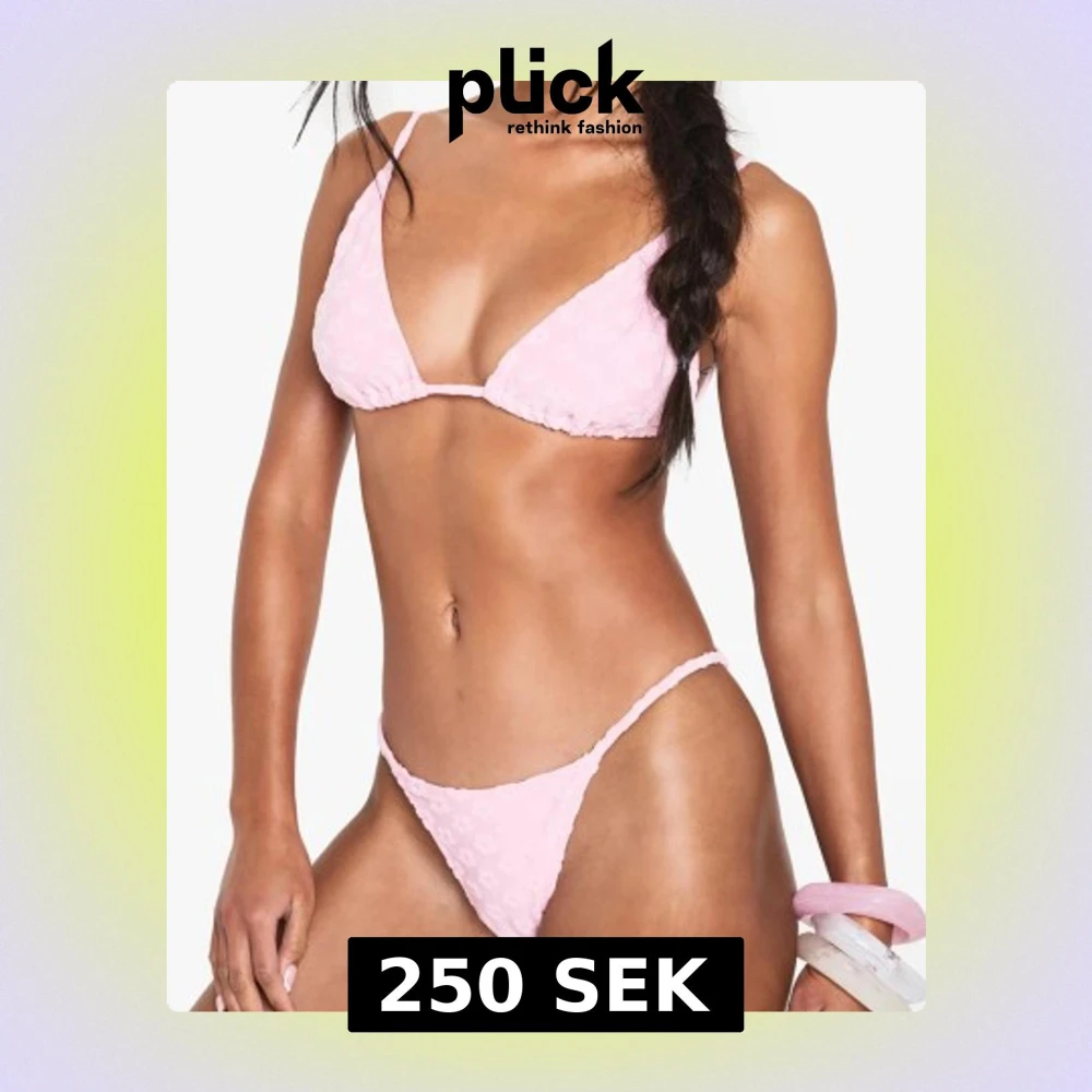 Supersöt ljusrosa bikini med blommigt mönster och smala axelband. Bikinin har en klassisk trekantsform på toppen och trosa med smala sidor, perfekt för strandhäng. Mjukt material med lätt struktur. Helt OANVÄND