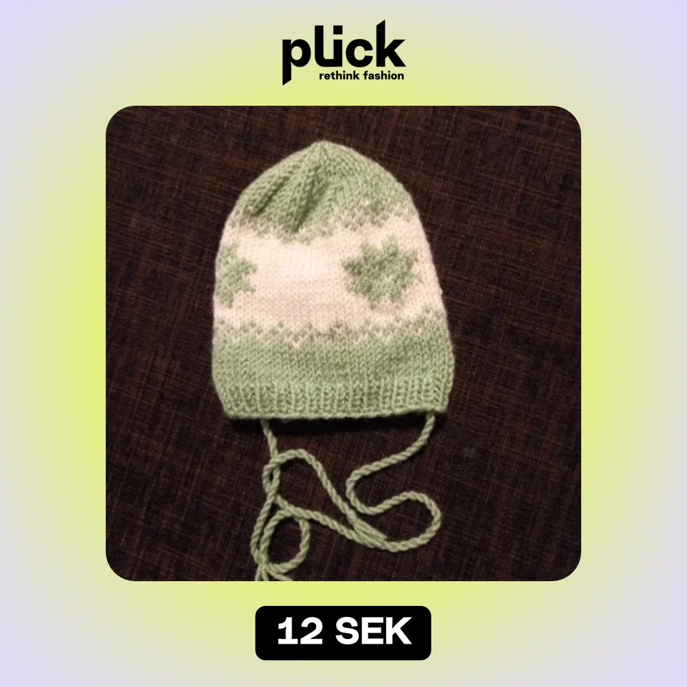 Stickad tunnare vårmössa i vitt och grönt i ca storlek 44/46 (se storleksjämförelse med mössa på bild 3-5). Oanvänd, endast upptvättad. Unisex Tvättad i parfymfritt tvättmedel och utan sköljmedel.