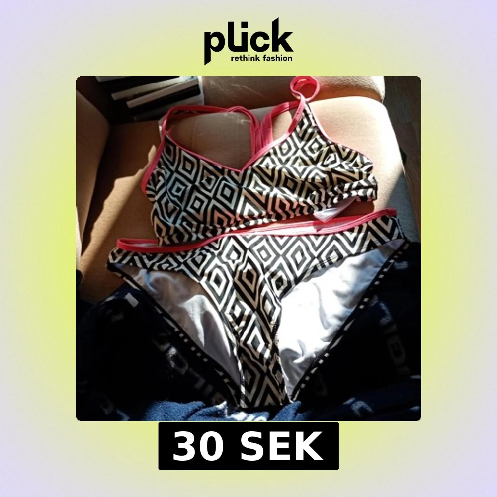 Snygg bikini med svartvitt grafiskt rutmönster och rosa kantband. Överdelen har sportig skärning med breda axelband och trosorna har klassisk passform. Perfekt för stranden eller poolen i sommar!