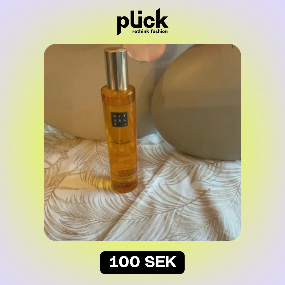 En elegant parfymflaska från Rituals med en gyllene färg och en silverfärgad kork. Flaskan har en smal och hög form, vilket ger den ett stilrent utseende.