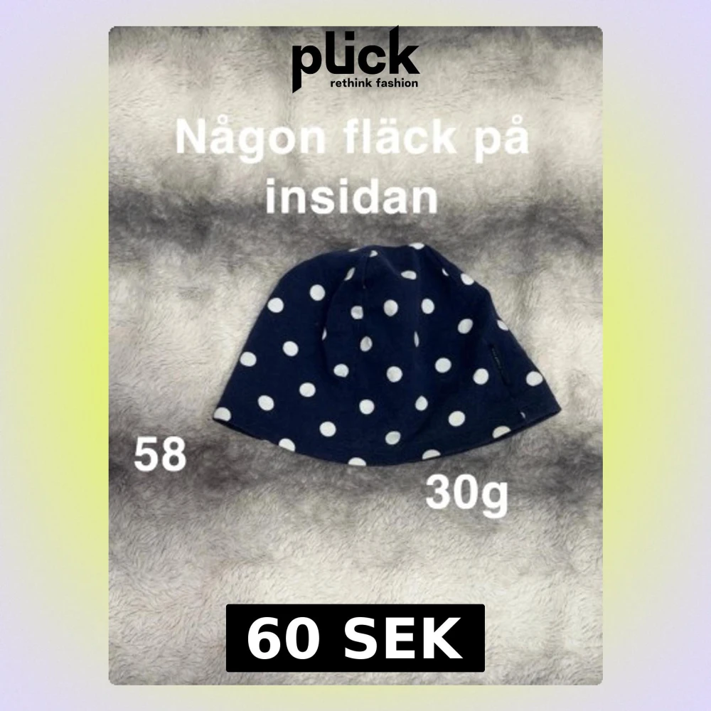 Snygg mörkblå mössa med vita prickar, perfekt för att ge din outfit lite extra stil. Mjuk och skön passform, enkel att bära både till vardags och när du vill sticka ut lite. Storlek 58🌸Någon fläck på insidan.