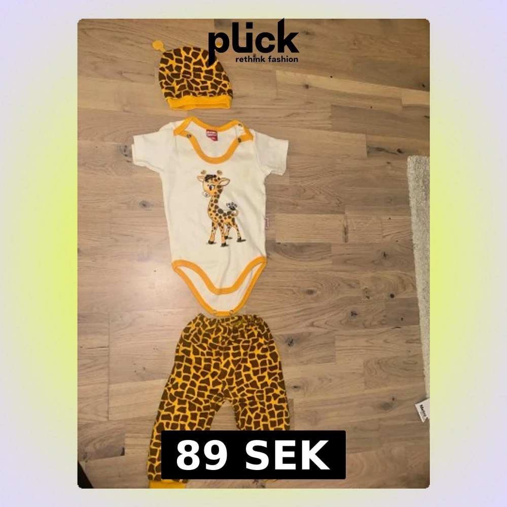 Säljer en söt babyväst med giraffmönster i gul och brun från Çikibom. Västen har rund hals, tryckknappar vid axlarna och är gjord i mjuk bomull. Perfekt för dig som gillar djurprint och vill ha något unikt till din lilla.Sött set med en body, byxor och en hatt. Bodyn är vit med en giraff på framsidan och gula detaljer. Byxorna och hatten har ett giraffmönster i gult och brunt.