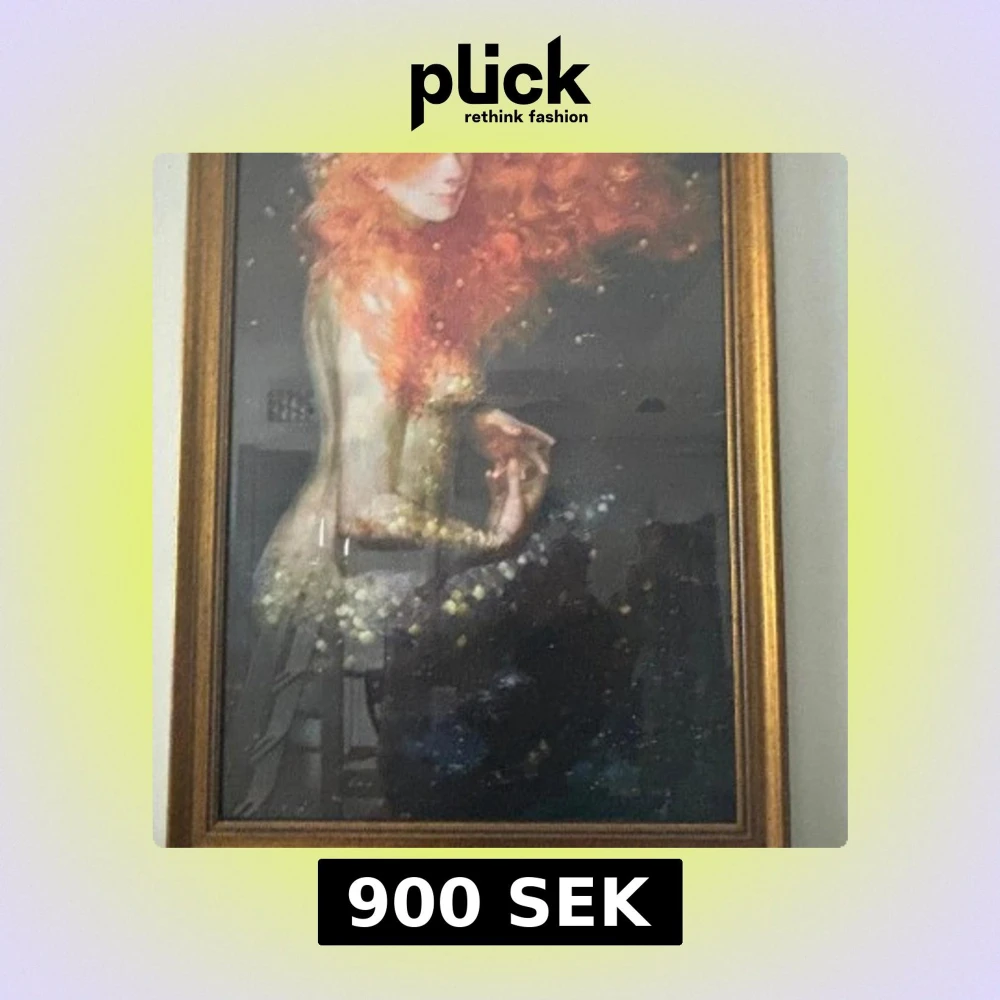 🫶🌺Tavla med regäll guldram det är en inramad konstbild av en kvinna med långt rött hår och fantasifullt uttryck sjöjungfru .. mått 79CM X69CM STOR TAVLA .GLAS SKIVA . Jättefin tavla 🫶🌺