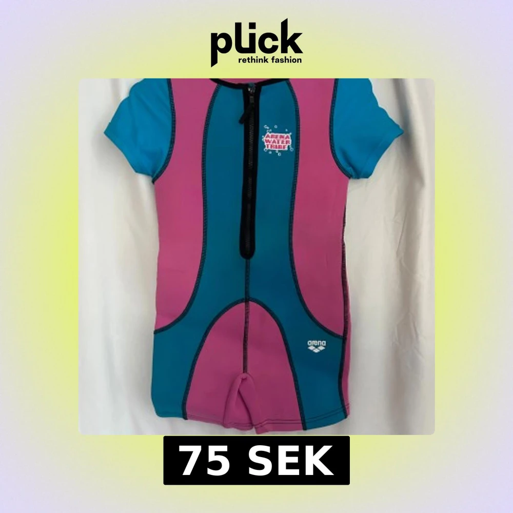 Cool våt/soldräkt från Arena Water Tribe i blått och rosa med svarta sömmar och dragkedja framtill. Baddräkten har korta ärmar och ben, tryckt logga och roliga vita figurer på ryggen. Materialet är 80% polyamid och 20% elastan, insidan är 100% neopren.