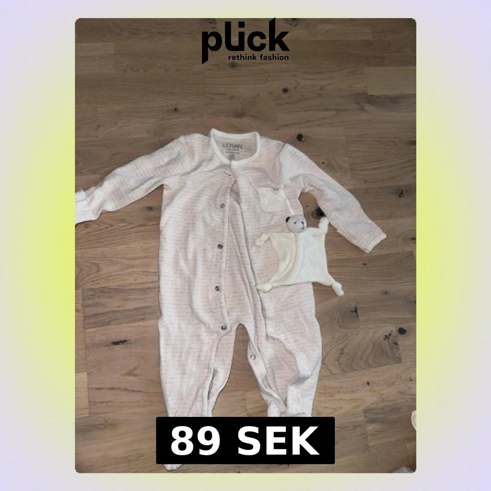 Säljer en söt babybody från Losan i ljusbeige med tunna rosa och grå ränder. Västen har långa ärmar, tryckknappar framtill och en liten ficka med ett mjukt nalle-gosedjur. Perfekt för mysiga dagar hemma.Söt pyjamas med tillhörande snuttefilt. Pyjamasen har en ljus färg med tunna ränder och knäpps med tryckknappar framtill. Den har även en liten ficka på bröstet.
