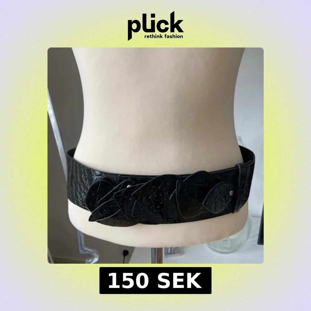 Unikt svart bälte med ett dekorativt bladmönster och struktur som liknar krokodilskinn. Bältet har en bred design och är perfekt för att ge en extra touch till din outfit. Detaljerna ger en elegant och stilren look.