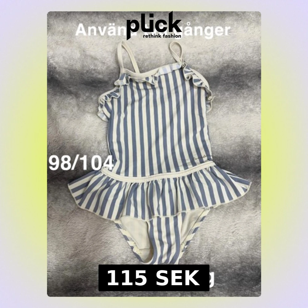 Säljer en söt baddräkt med blå och vita ränder och volangdetalj i midjan. Axelbanden är smala och det finns små volanger vid axlarna. Perfekt för strand eller poolhäng!🌸 Använd två gånger. Storlek 98/104