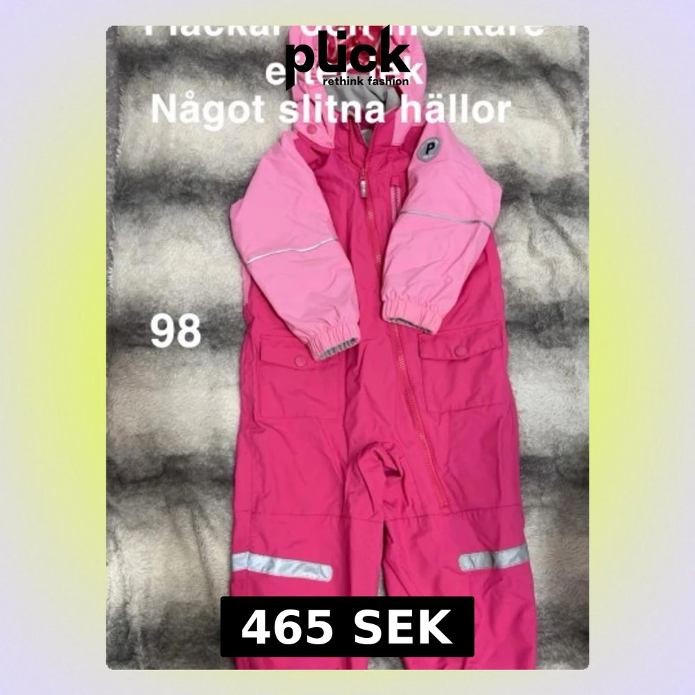 Säljer en rosa skaloverall från Polarn O. Pyret i storlek 98. Overallen har två nyanser av rosa, reflexdetaljer på ben och ärmar, huva och dragkedja framtill. Materialet är tåligt och overallen har praktiska fickor med knappar.🌸 Använd två gånger eftersom vi har haft skalset som använts istället. Fläckar och mörkare efter lek. Var namnad med lapp men bottagen. Något slitna hällor. Storlek 98.