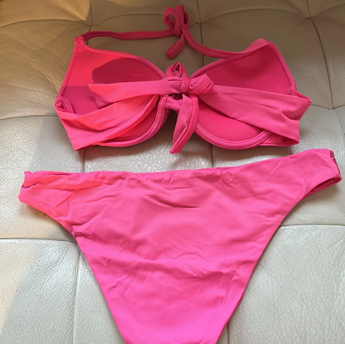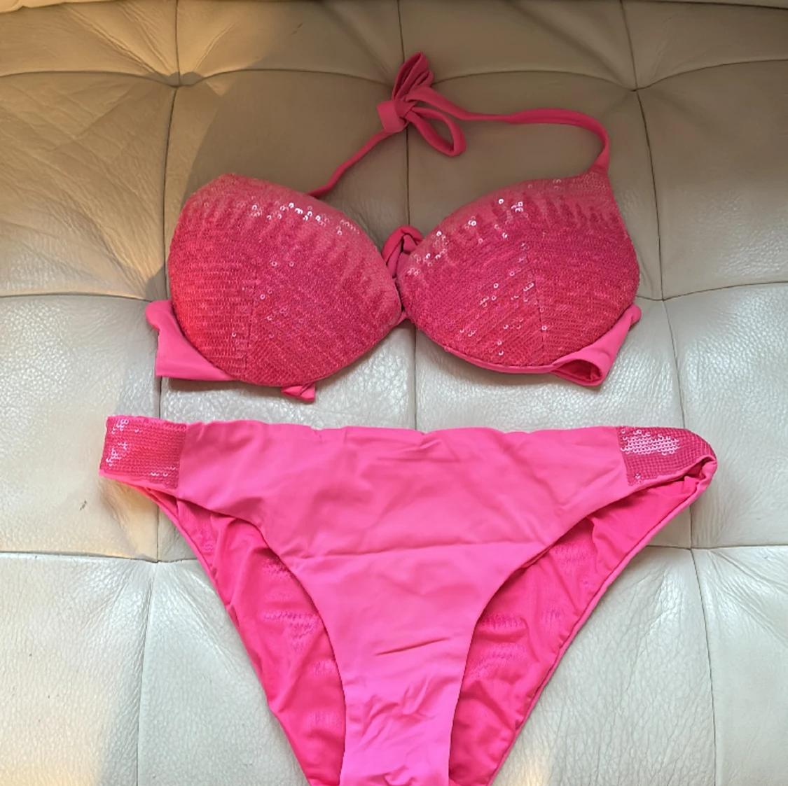 Jag säljer dena bikini från calzedonia. underdelen och överdelen är i s och överdeles kupa skulle jag säga är 75b, jag skulle säga att det är Push up i överdelen.