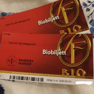 Säljer två stycken biobiljetter, 100kr styck. Funkar för en ordinarie biljett på SF bios biografer i hela Sverige. Går ut den 24/3. Skickar koden via sms! Säljer för att jag inte har tillfälle för att använda dessa!