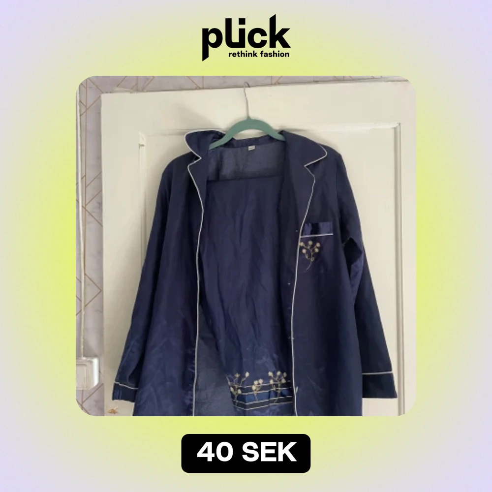Säljer en mörkblå långärmad pyjamas sett med vita detaljer och ett fint blommigt broderi på fickan och nederkanten. Jackan har en avslappnad passform och är perfekt när man ska sova. Den är i storlek 38/40 och i bra skick. Perfekt när man sover då den inte är så varm.