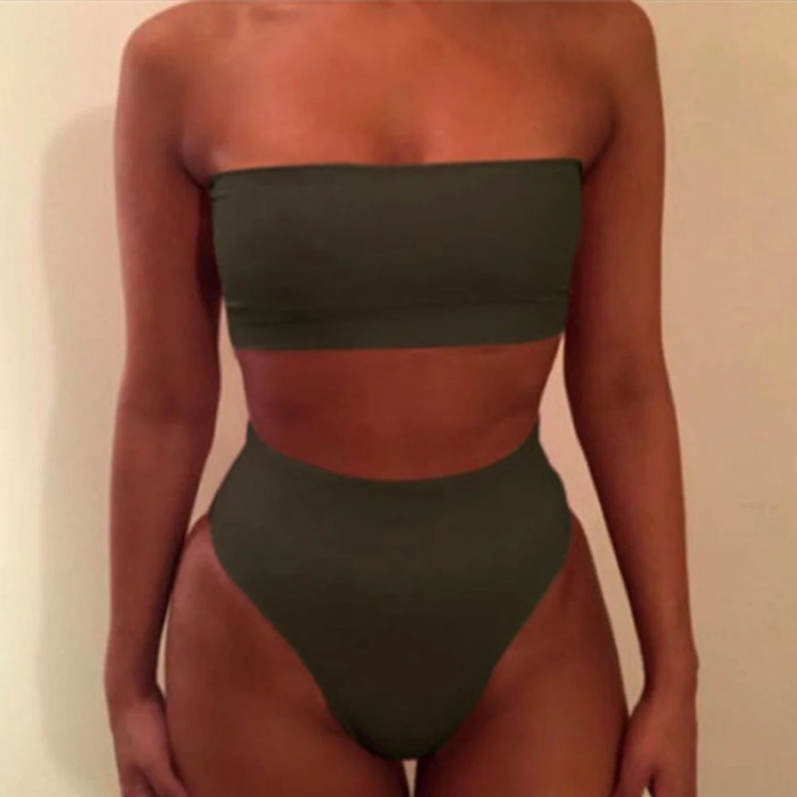 Skit snygg bikini i khaki färg, högmidjade trosor med bandeau överdel! Aldrig använt för att den är lite för stor för mig✨