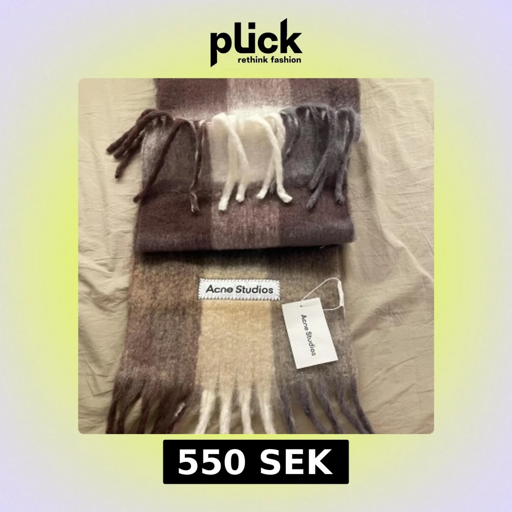 Supermjuk och fluffig halsduk från Acne Studios i rutigt mönster med beige, bruna, grå och vita toner. Lång modell med fransar i ändarna. Helt ny och aldrig använd. Skickar inom 1-3 dagar.