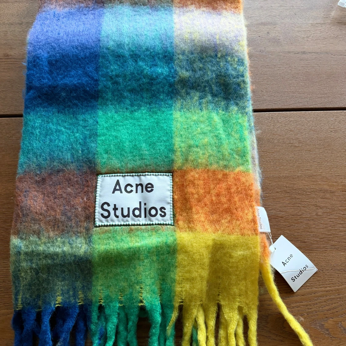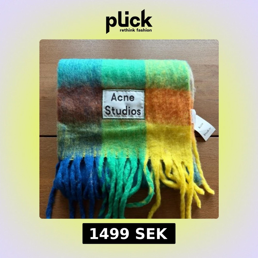 Färgstark och fluffig halsduk från Acne Studios med rutigt mönster i blått, grönt, gult, orange och brunt. Stor logotyp framtill och långa fransar i ändarna. Perfekt statement-piece för att lyfta din outfit under kyliga dagar. Nu med tag. Nypris är runt 3300kr