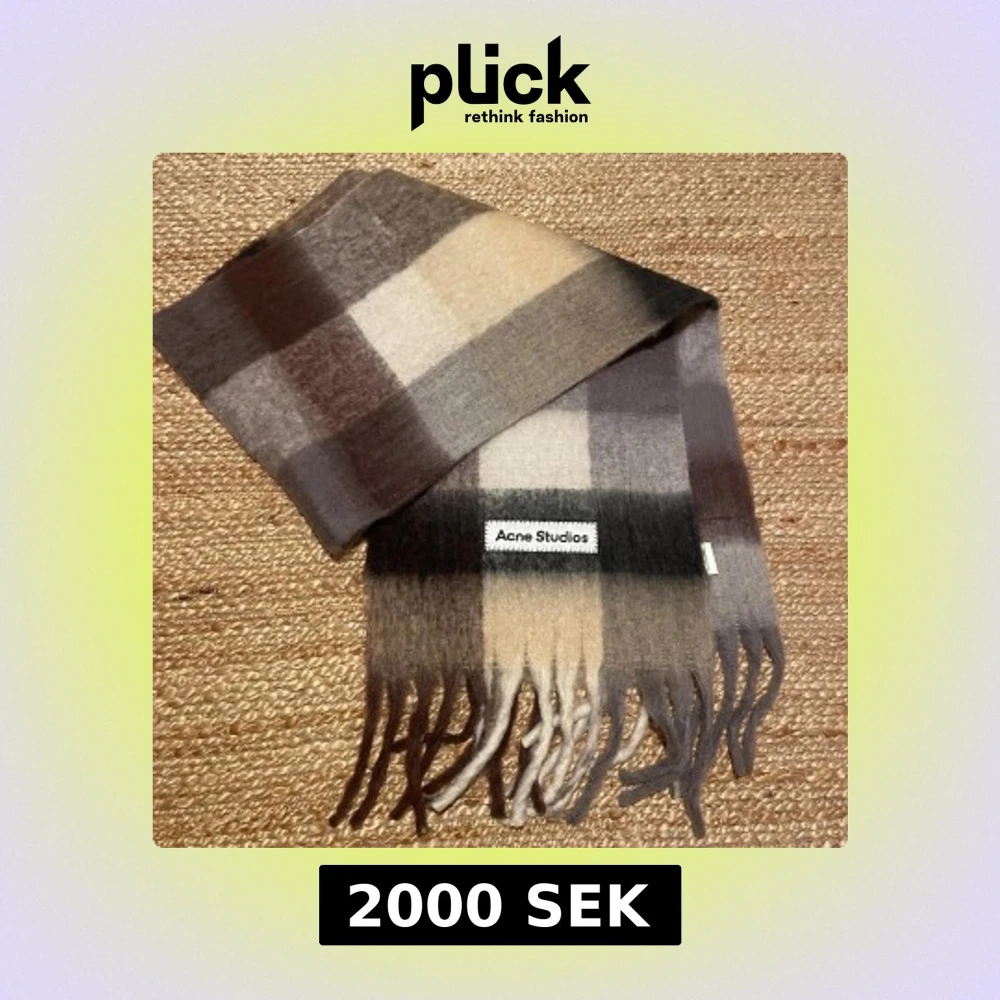 Snygg rutig halsduk från Acne Studios med stora blockrutor i beige, grått, brunt och svart. Mjuk och fluffig känsla i ullblandning, med långa fransar i ändarna och tydlig logotyp framtill. Perfekt nu till vintern för att ge din outfit en cool touch. Använd förra året men i mycket bra skick. Priset går att diskuteras. Nypris:3100