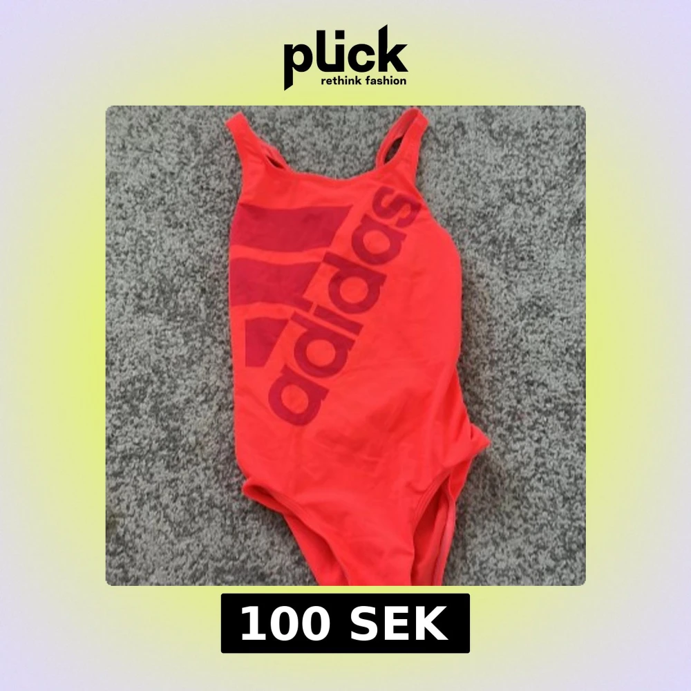 Säljer en röd/orange baddräkt från Adidas med stort logotryck i mörkrött framtill. Modellen har smala axelband och öppen rygg. Perfekt för simning och strandhäng.