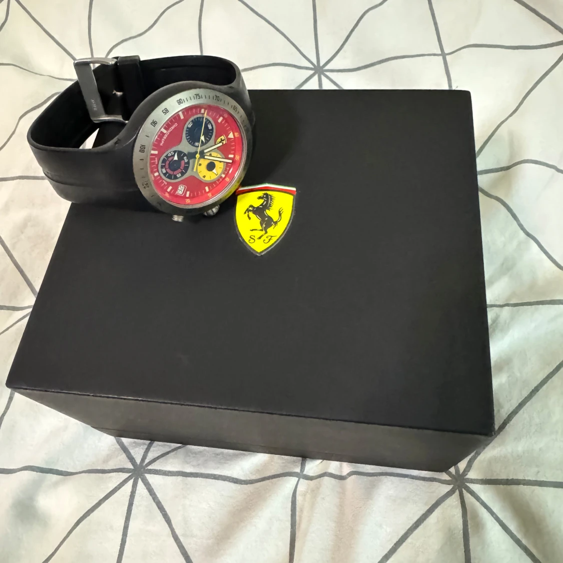 Säljer min Äkta Ferari klocka köpt i Dubai. Äktighets bevis finns, box ingår. Klockan är värt 4000 kr. Klockan är vattentät vid 50 meter djupt. Super fin klocka som passar både vardag o speciella evenemang.