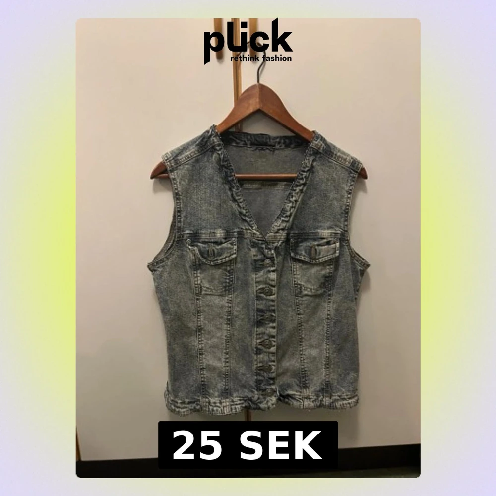 Säljer en snygg grå jeansväst med slitna detaljer och v-ringning. Västen har två bröstfickor med lock och metallknappar framtill. Perfekt att slänga över en t-shirt för en cool look.
