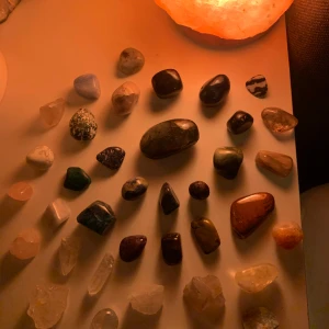 Här har vi en massa olika kristaller som köps i detta kit. Här finns bergkristall, rökkvarts, ametist, tigeröga, citrin, rengbågsagat, rosenkvarts, svart turmalin, kattöga, aventurin, blåagat, zebraagat, malakit, botzwana agat osv.