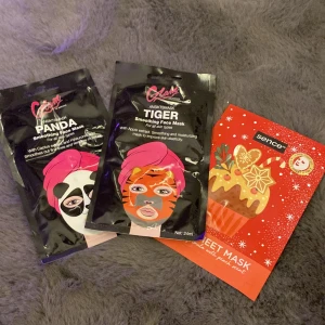 3 stycken ansiktsmasker en panda en tiger och en vanlig vit en kostar 10kr