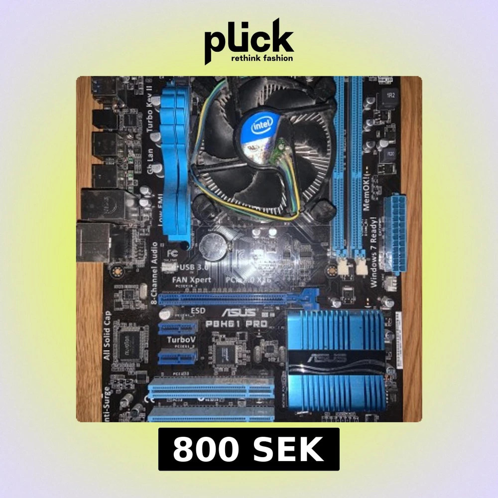 Säljer ett ASUS P8H61 PRO moderkort med installerad processor. Moderkortet har blå och svarta detaljer, flera PCIe-platser, USB 3.0, 8-kanals ljud och stöd för DDR3-minnen. Perfekt för dig som bygger eller uppgraderar din stationära dator. Pris 800kr