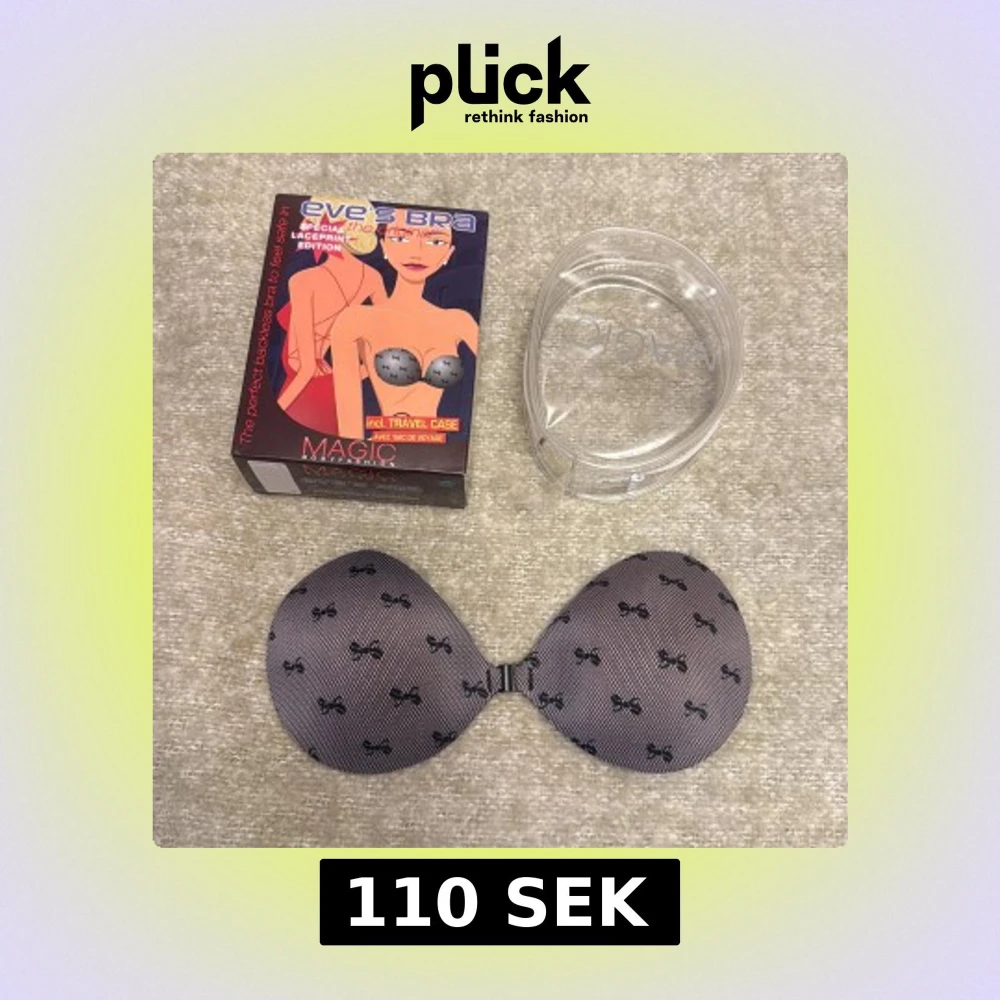 Säljer en svart bandlös bh B från Magic Bodyfashion, modell Eve's bra. Smarta, självhäftande kupor som gör bysten något större och ger en bra push up-effekt. Kuporna är följsamma och fäster bra på kroppen. Smart t ex under en rygglös klänning eller topp.Kommer med en praktisk reseförpackning.